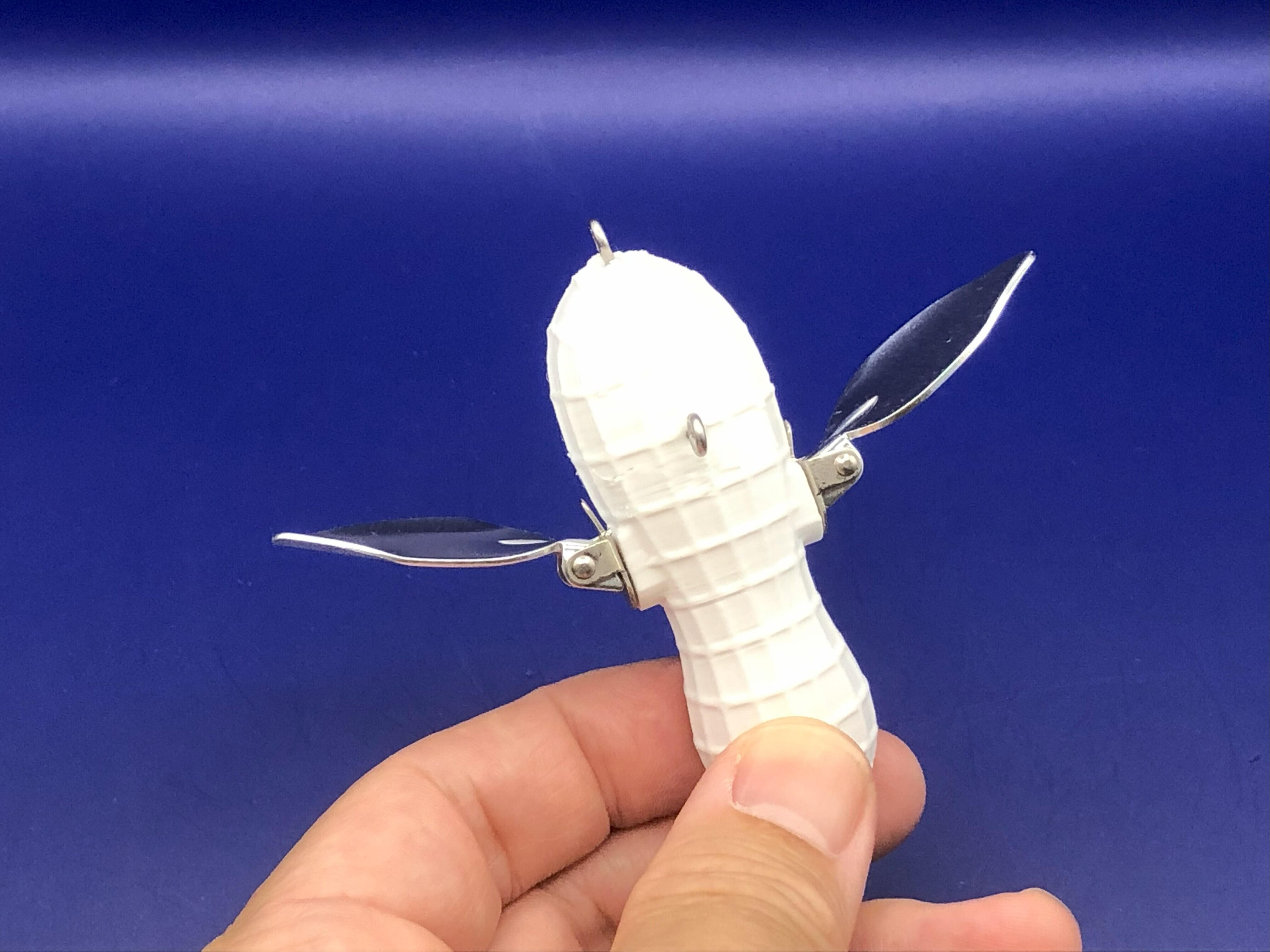 愛嬌あるシルエットと軽快な羽根アクションで、バスを水面まで誘い出します。