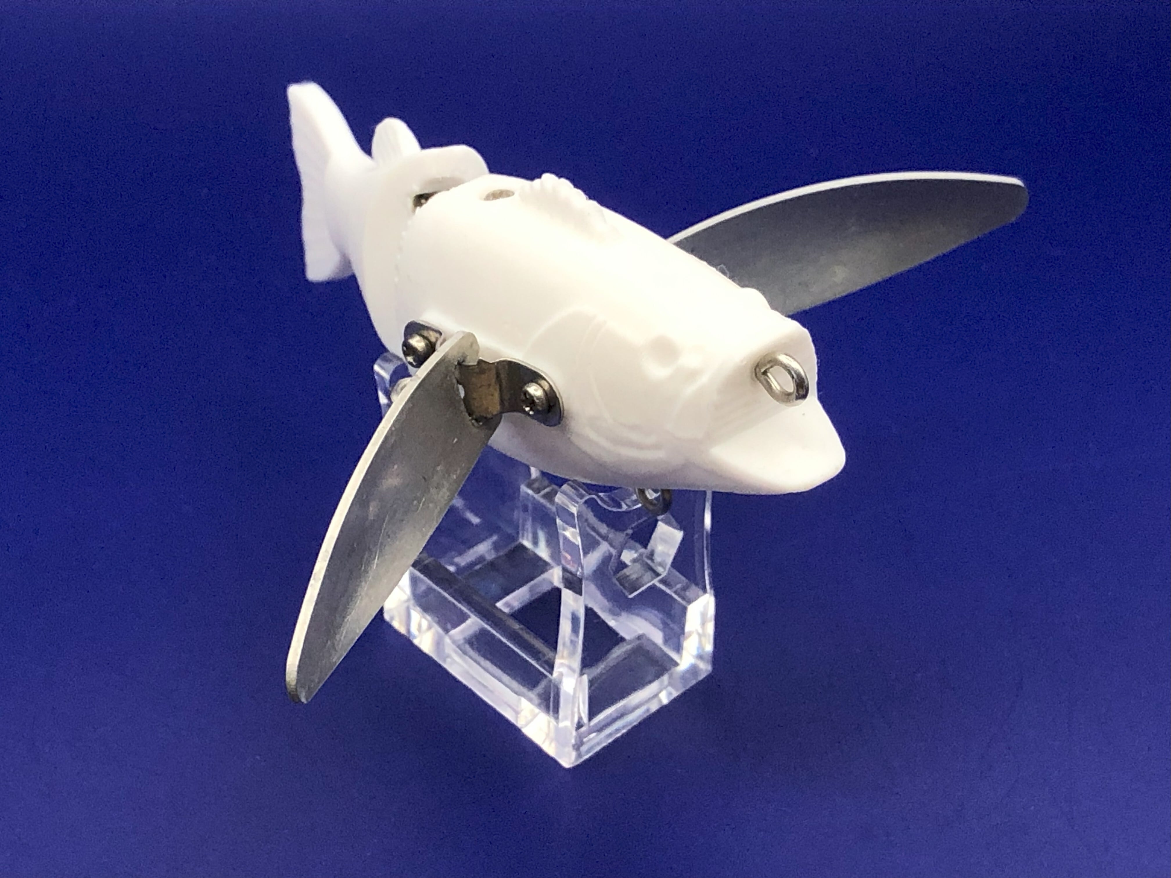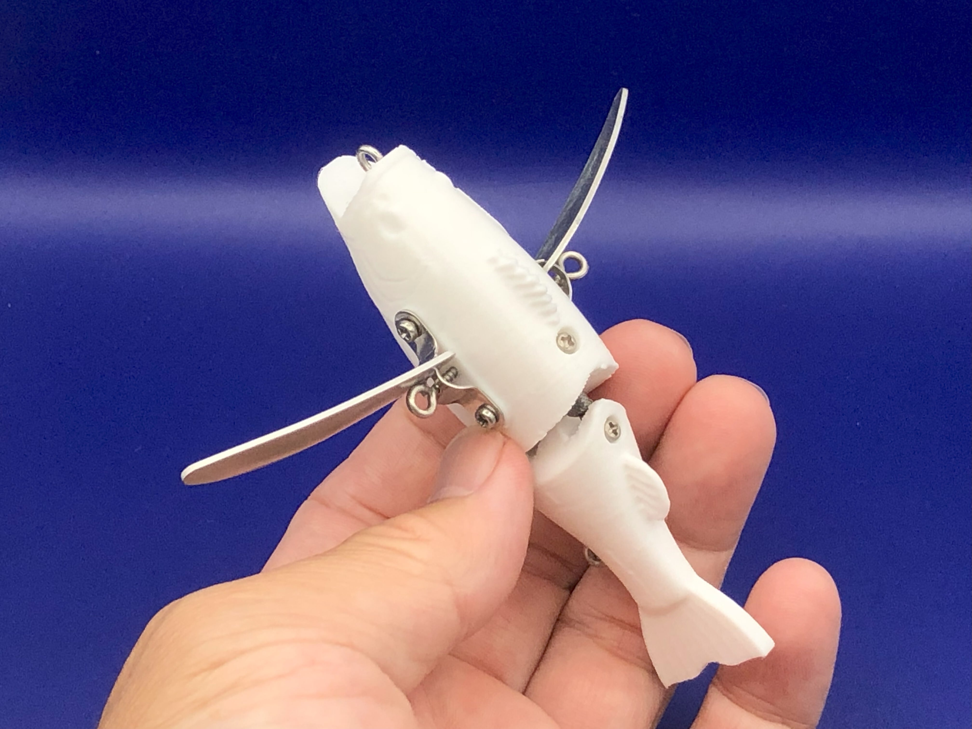 リアルな魚型シルエットと2連結ボディによる艶めかしい動き、さらに羽根の揺動を組み合わせることで、水面で圧倒的な存在感を発揮します。
